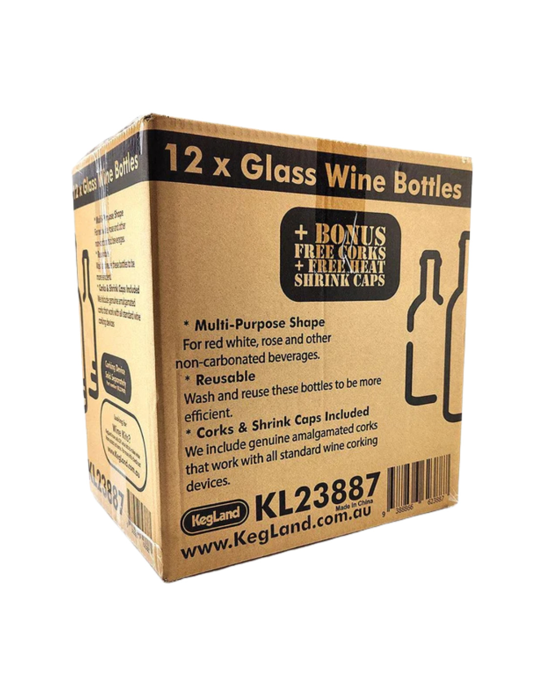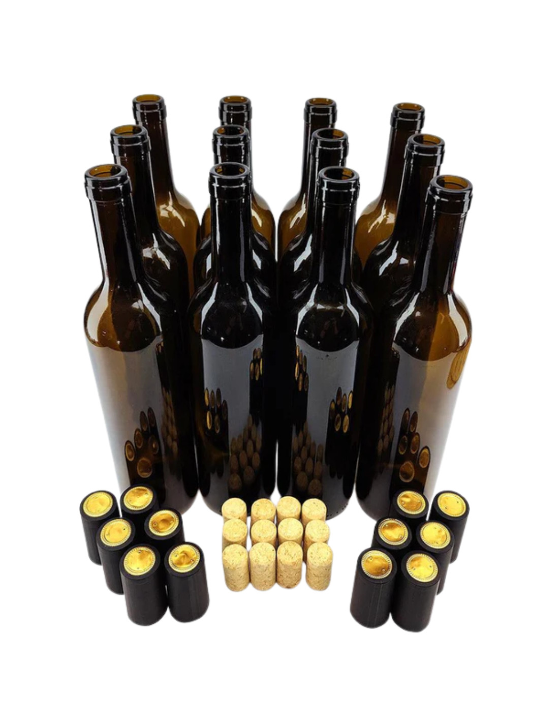 12 bouteilles teintées ambrées de 750 ml, 12 bouchons en liège véritable,