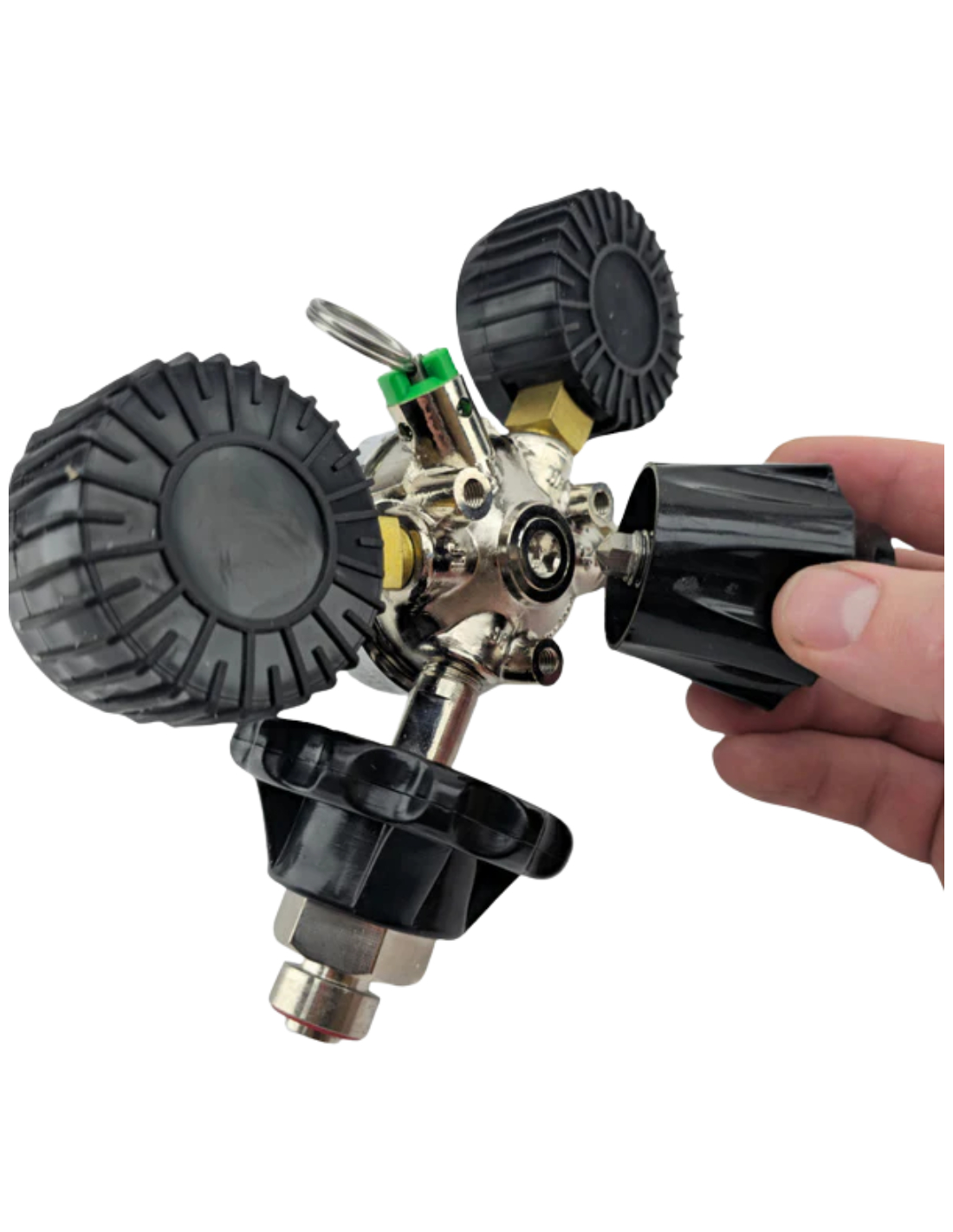 1. Serrage à une main sur la bouteille . Aucune clé n'est nécessaire pour fixer le détendeur à votre bouteille de CO2. La fixation se fait facilement d'une seule main grâce à la molette de serrage.