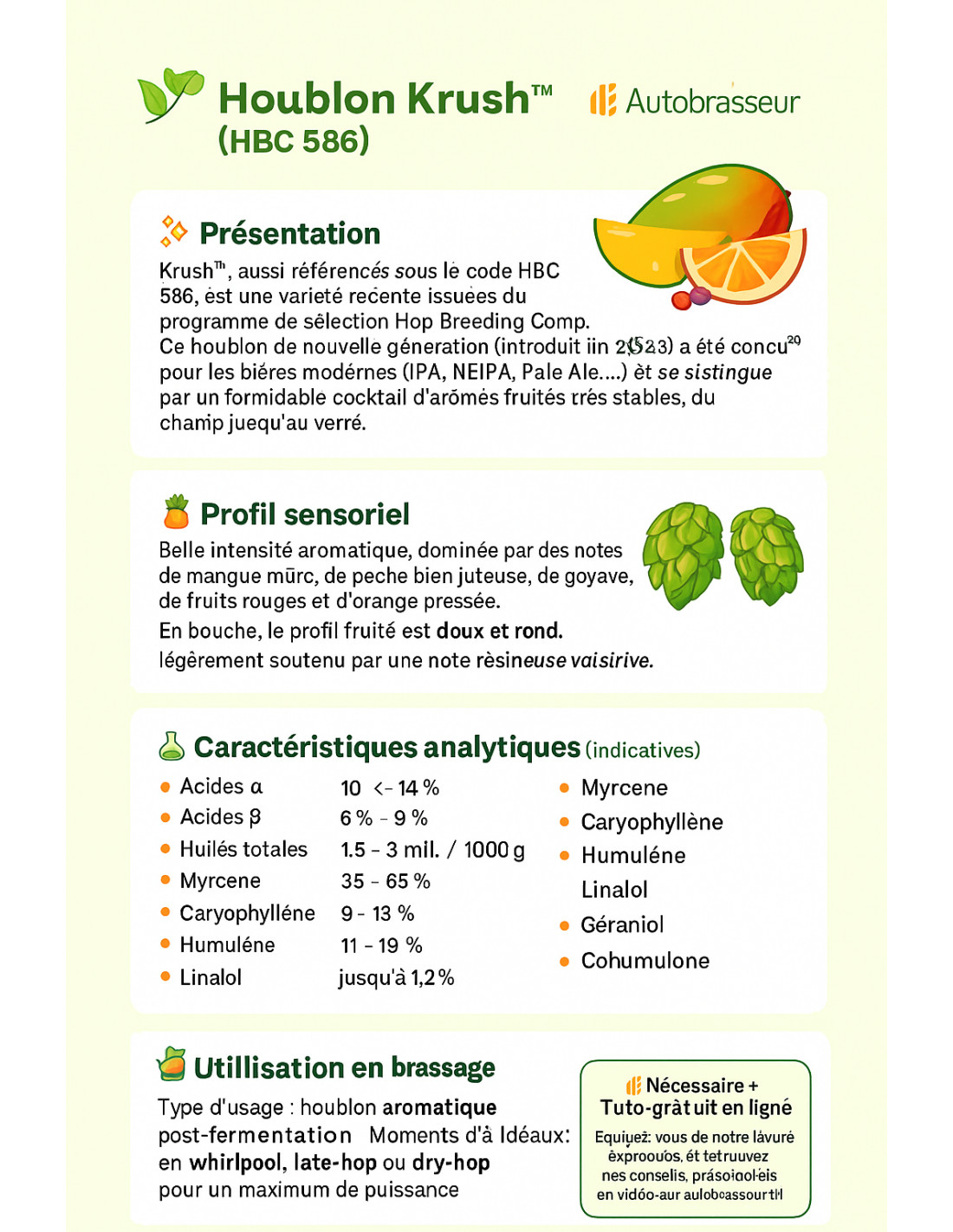 Moments d’ajout idéaux : en whirlpool, en late-hop ou en dry-hop, pour exprimer pleinement son potentiel aromatique