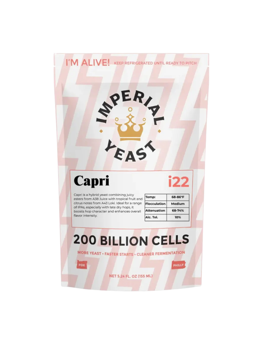 Capri a tendance à rester en suspension pendant la fermentation et forme un cône de levure compact une fois stabilisée. Cette souche se prête particulièrement bien à l'ajout de houblon à cru juste avant la fin de la fermentation active. Cette souche de levure n'est pas un organisme génétiquement modifié (OGM).