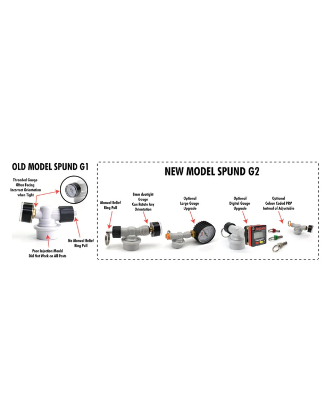Ce nouveau Spund G2 est mieux conçu que l'ancien modèle Spund G1. Comme vous pouvez le constater ci-dessous, l'ancien Spund G1 présentait un manomètre fileté souvent mal orienté, ne disposait pas de soupape de surpression manuelle et son moulage par injection était de mauvaise qualité, ne fonctionnant pas sur tous les fûts. C'est pourquoi le Spund G1 a été abandonné peu après sa commercialisation et a été remplacé par le modèle G2.