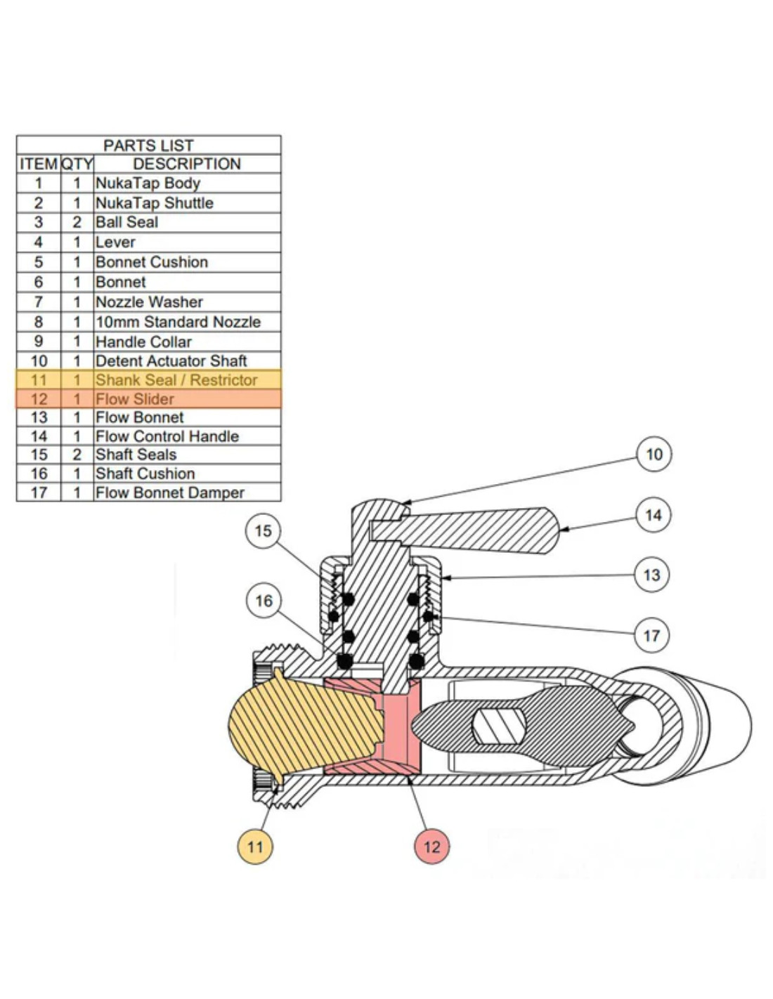 Mécanisme de contrôle de flux de 2e génération pour le kit de mise à niveau NukaTap FC. Il remplace les références 11 et 12 du schéma du produit sur la troisième photo.
